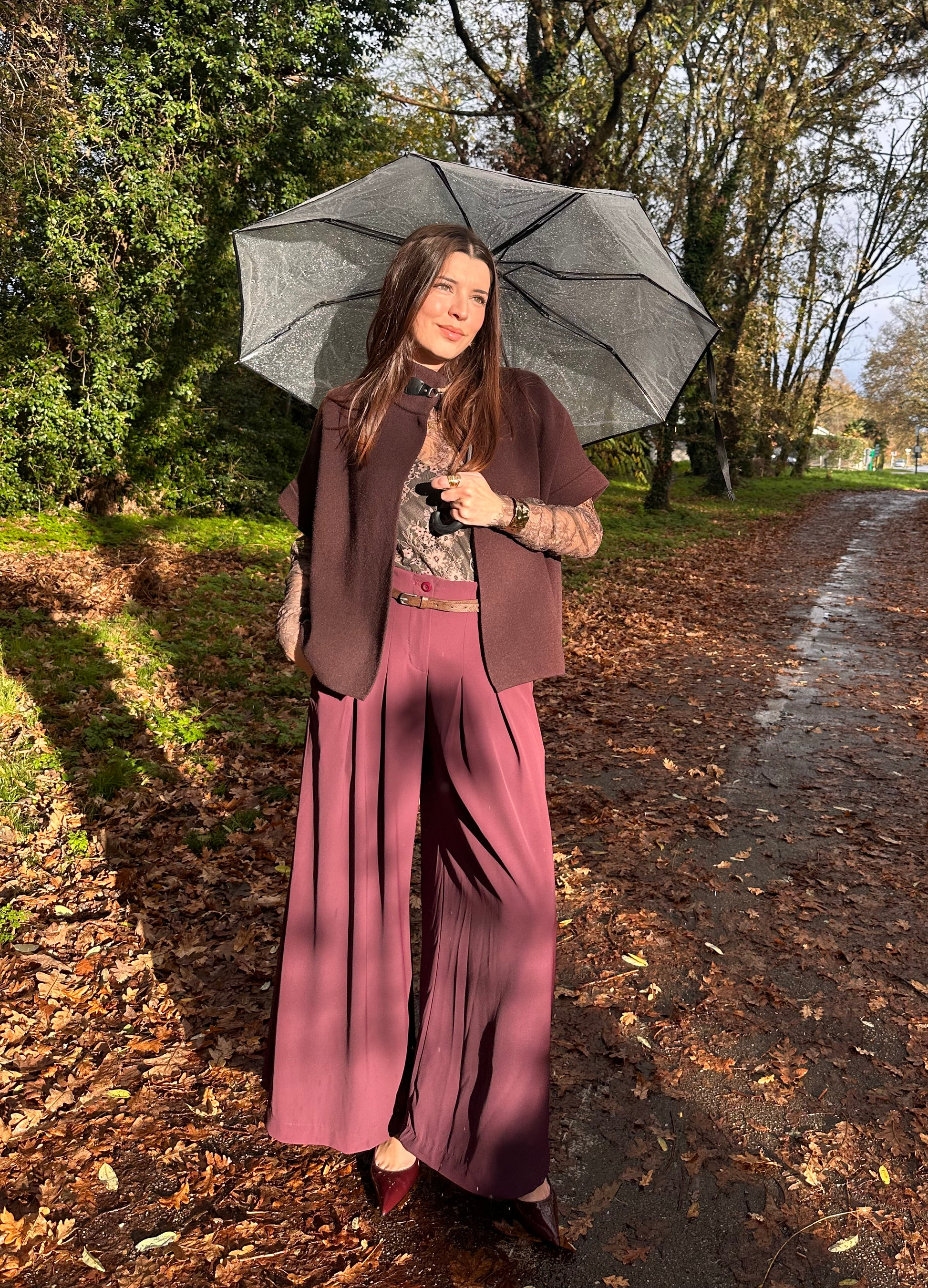 Pantalon large ultra fluide bordeaux avec ceinture fine camel.